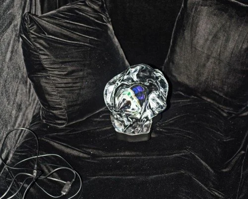 In the exhibition ‘Update from the wasteland I’ plays on a raspberry pi screen embedded in a solid glass sculpture as part of ‘Network Bed’ (2017), a sunken velvet bed installation.